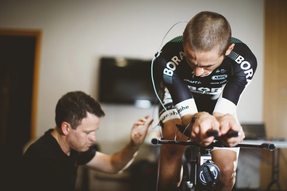 Die Bewegungen des Radfahrers werden, während der Fahrer in verschiedenen Leistungsbereichen pedaliert in 3D gemessen LED-Punkte zeichnen 18 Mal pro Sekunde auf den Millimeter genau Daten auf